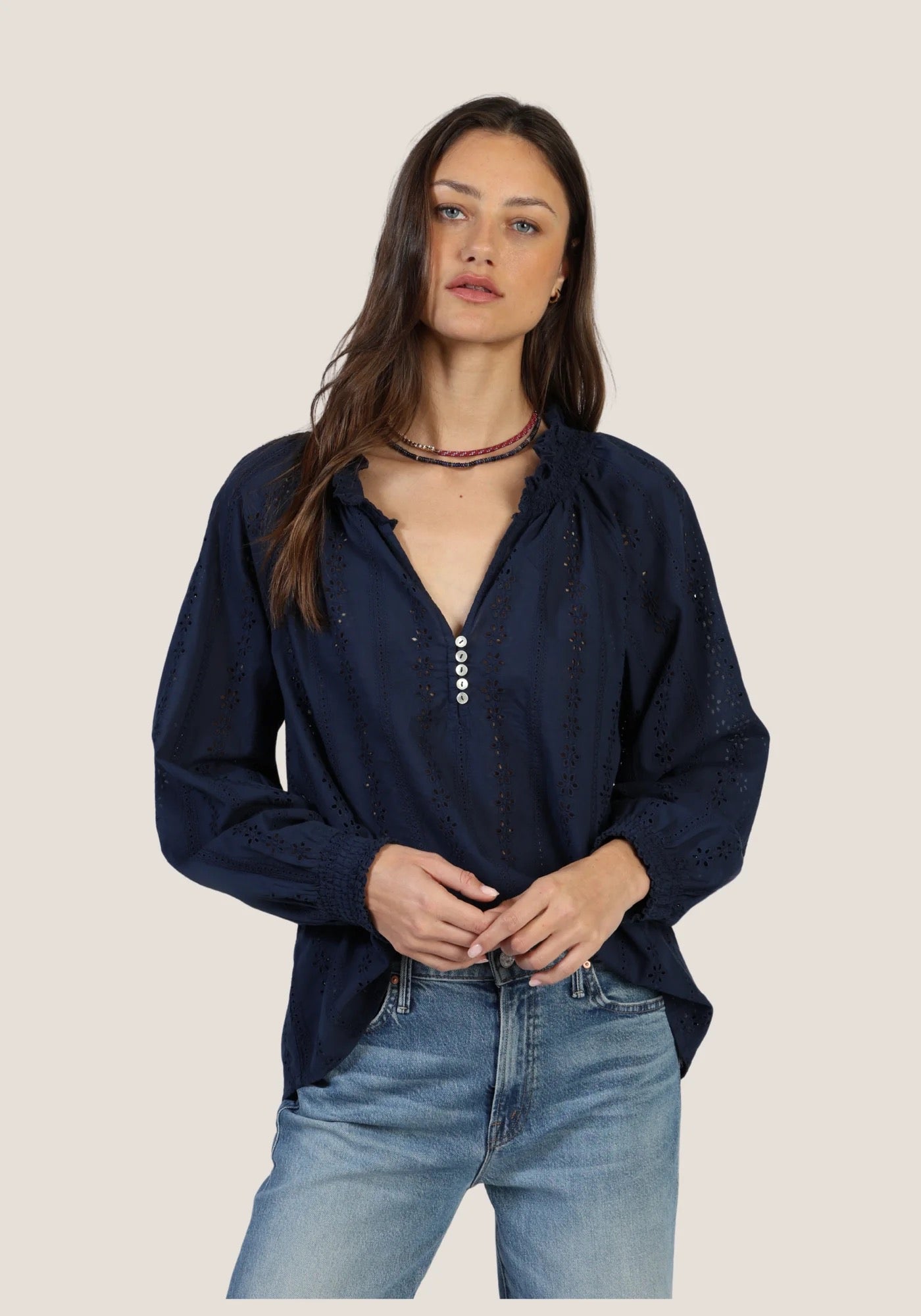 The Dylan Talulah Blouse features intricate eyelet detailing in a deep navy blue fabric, offering a sophisticated and feminine aesthetic. The V-neck design enhances versatility, suitable for both casual and formal settings, while the breathable material ensures comfort throughout the day.