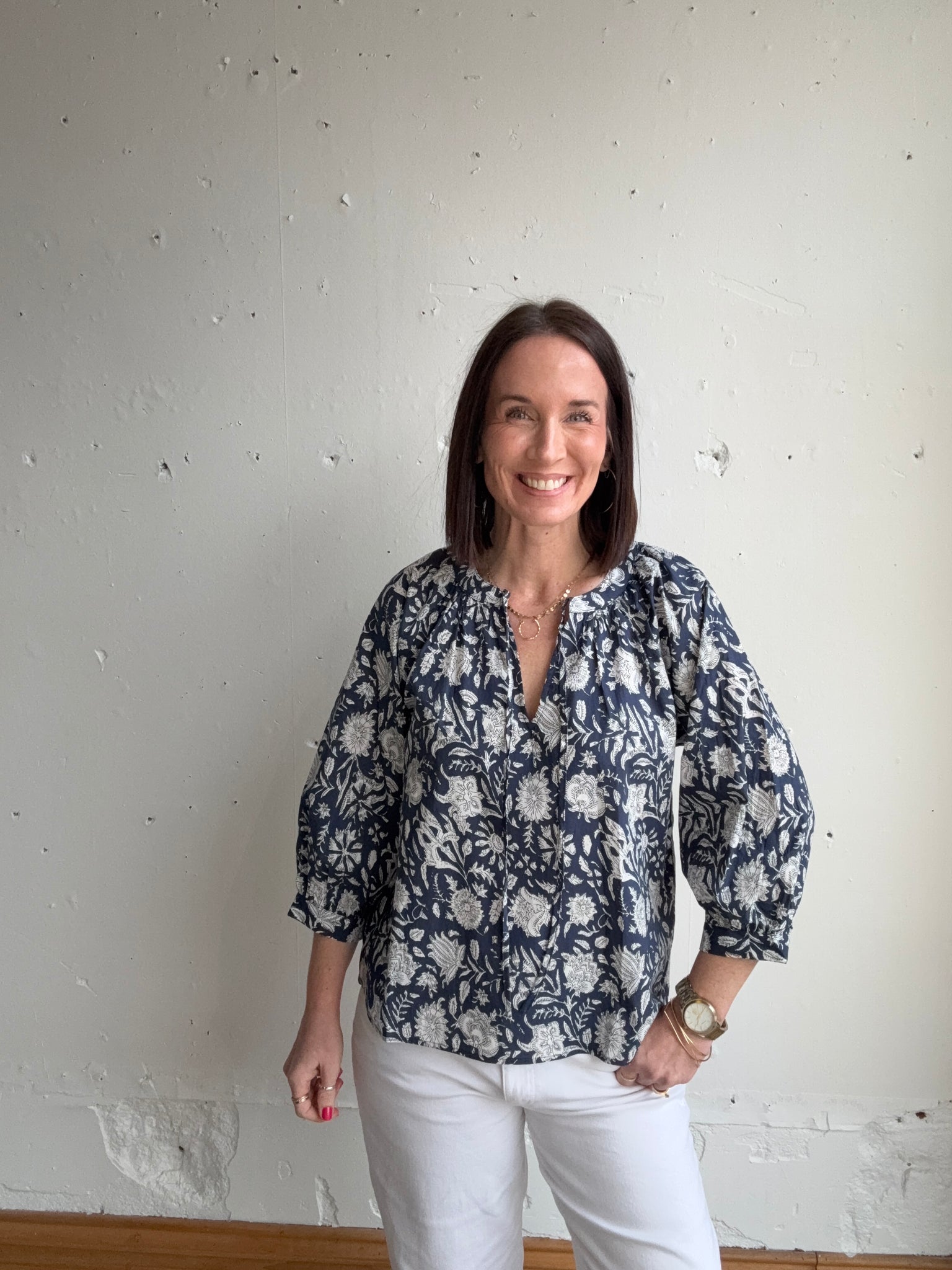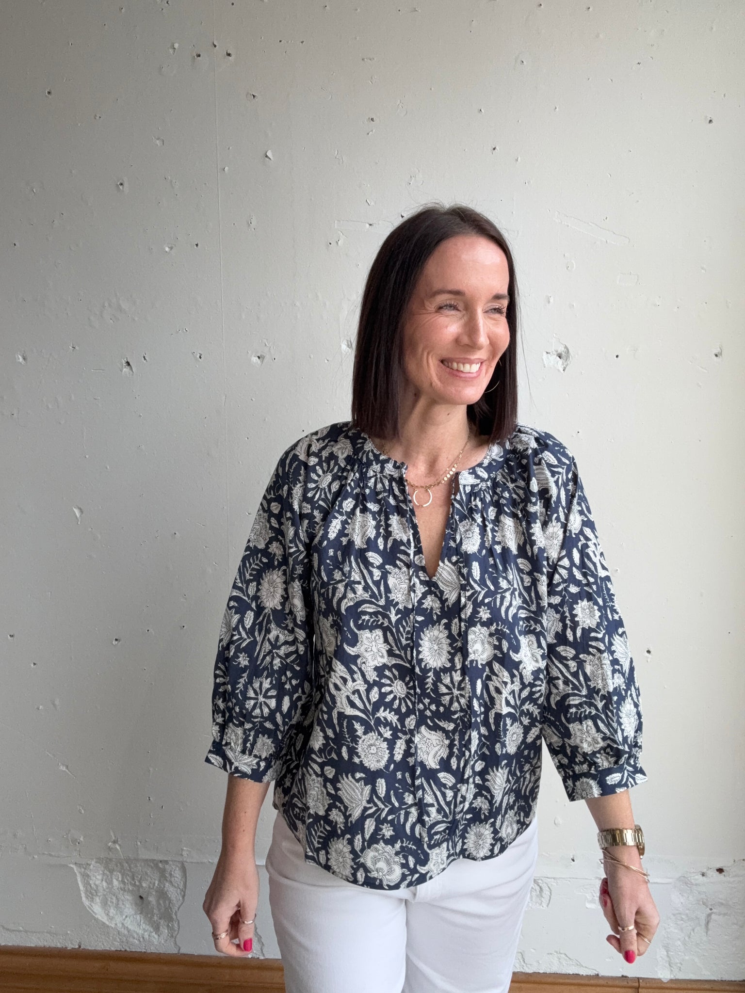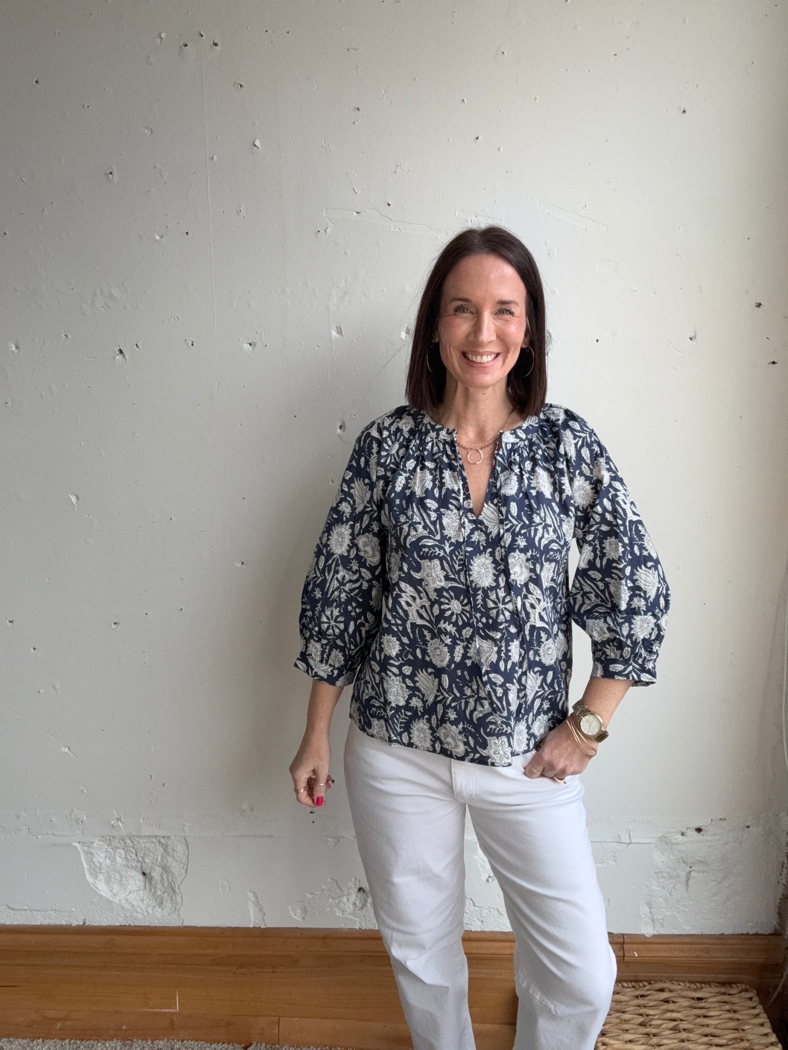 3/4 sleeve, shirred, cotton block print