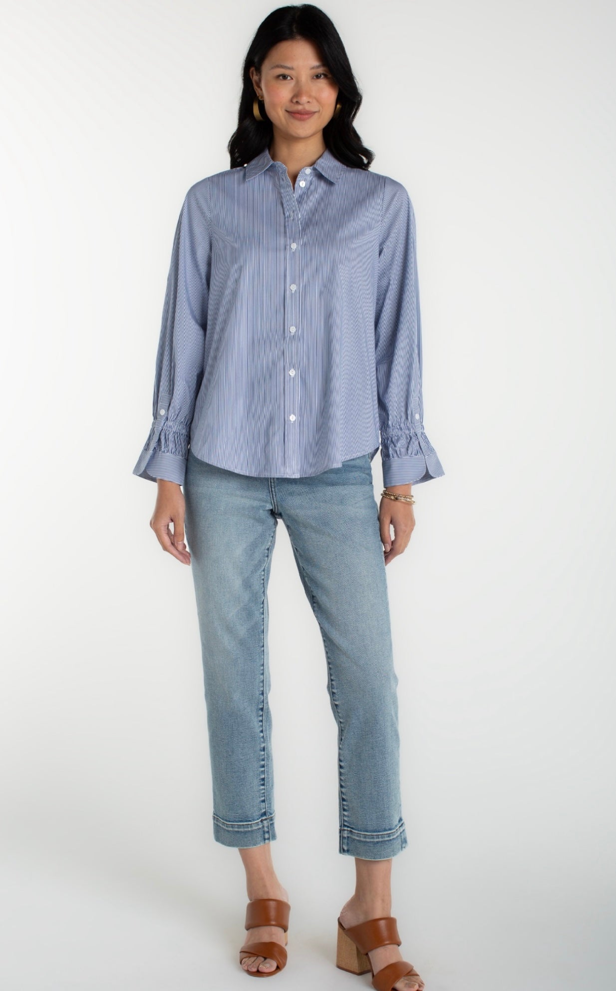 Stripes never looked so fun! This Liverpool button down features delicate micro stripes and adjustable sleeves that let you roll, cuff, or wear them long whatever mood strikes. Perfect for layering or wearing solo, it's the versatile piece that works as hard as you play. Dress it up or down and make it your own.