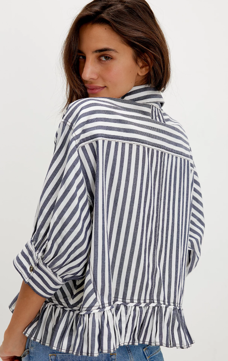 Features: Striped cotton fabrication, collared-neckline, button-front closures, drop-shoulder ¾ sleeves with cuffs, ruffled hem